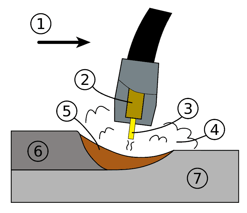 © Spangineer, GMAW weld area, zugeschnitten von Samuel Schneider | CC BY-SA 3.0 UnportedDas Metallschutzgasschweißen gehört zu den Lichtbogenschweißverfahren. Wie du auf der Grafik erkennen kannst, schmilzt hierbei zusätzlich eine endlose Drahtelektrode in Tropfen ab.